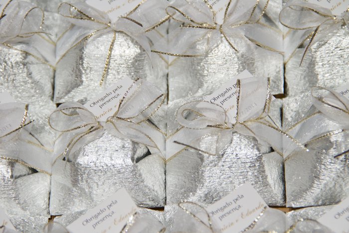 Para integrar a mesa de doces, nosso Bem Casado recebeu apenas o detalhe de um lacinho. E como lembrança foi oferecido no glamour da embalagem prata e fita de voil com brilho dourado, uma feliz combinação que se fez presente no almoço de casamento da Patrícia e Eduardo. Felicidades aos noivos!