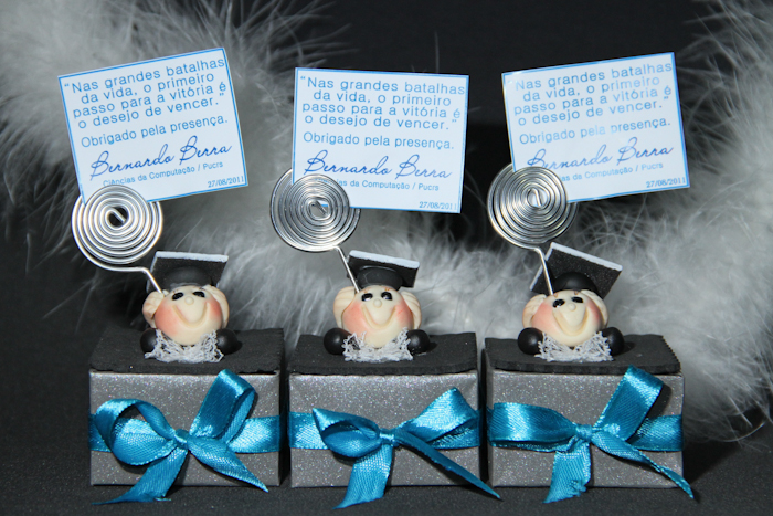 Finalizamos o mês de Maio e iniciamos Junho com muitas solicitações de orçamentos para Formatura e por isso começamos postando uma foto de nosso “Bem Formado”(versão do doce Bem Casado) que vai embalado nas cores do curso e decorado com um porta-recados imantado feito em biscuit personalizado no formato de cabecinha de formanda(o). É um modelo recorde de preferência e que fica muito bem integrado ao contexto.